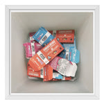 WHITE TRASH es una serie de 63 fotografías, que estarán expuestas en un mismo muro, de los contenedores de basura de cada habitación que limpié, dando cuenta de la cantidad de productos que son desperdiciados cada día. Mis fotografías usan la estética de la fotografía publicitaria, en donde la limpieza, pulcritud y fondos blancos son característicos. Pero en mi caso busco mantener esa pulcritud en los objetos que encontraba en las basuras. Los coleccionistas tendrán la oportunidad de ser curadores de su propia obra, ya que cada quién podrá escoger el políptico que quiera, jugando con la selección de las imágenes que quiera llevar. No tienen un orden particular en la exposición, esoto va más en el azar y el el gusto de cada quién.