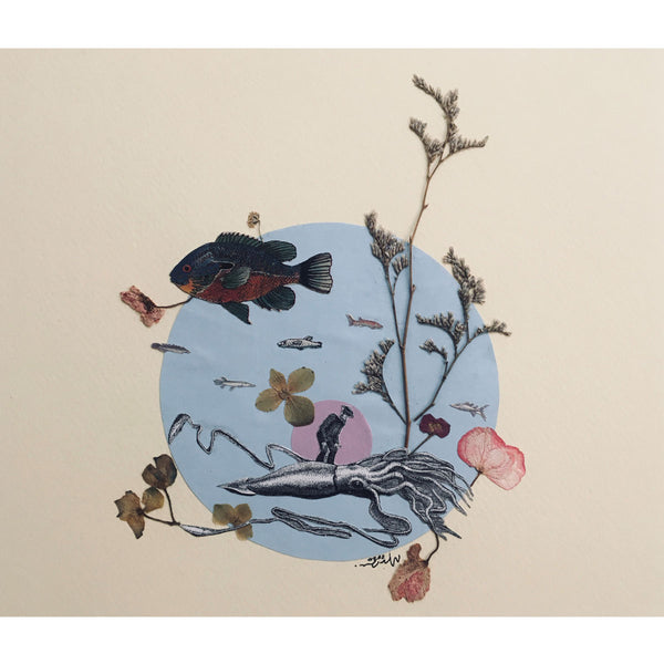 retrata una visión del entorno acuático, amoldando la vida marina dentro de un círculo, creando así una representación estética del mundo acuoso ideal donde todas imágenes se entrelazan. Con esta serie la artista renuncia a la realidad de la vida marina que conozco, adentrándome en un minucioso circulo de búsqueda de recortes de múltiples fuentes con imágenes de diferentes tipos y contextos pero que me sugieren un solo entrono: el acuático. Esta serie de collages sustraen la esencia de realidades alternas a la mía y hasta del mismo espectador, creando así imágenes propias concebidas con una idea obsesiva comprimida entre círculos, la naturaleza y el retrato de lo que vive, está y rodea el mar.