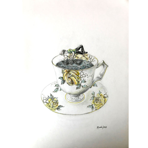 Esta serie surgió en el contexto de la pandemia, inspirada por la libertad de nuestra mente, que no tiene límites, aún en medio del aislamiento y el encierro. Para mí el café siempre ha sido algo que me reconforta. Es también un evento social, un momento afectuoso para vernos y conversar, y esas conexiones humanas fue algo de lo que el aislamiento social también nos privó. Sin embargo, a una situación tan compleja y oscura quise darle una nota positiva y transformarla en un mundo de posibilidades, aún en soledad y dentro de un espacio delimitado. La taza de café, además de ser un elemento que en mi día a día me da tranquilidad y que me hace vivir más despierta –un lugar intangible de seguridad y de bienestar– en mis dibujos se convirtió en una metáfora del lugar que habitamos, una metáfora de nuestra casa.