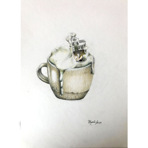 Esta serie surgió en el contexto de la pandemia, inspirada por la libertad de nuestra mente, que no tiene límites, aún en medio del aislamiento y el encierro. Para mí el café siempre ha sido algo que me reconforta. Es también un evento social, un momento afectuoso para vernos y conversar, y esas conexiones humanas fue algo de lo que el aislamiento social también nos privó. Sin embargo, a una situación tan compleja y oscura quise darle una nota positiva y transformarla en un mundo de posibilidades, aún en soledad y dentro de un espacio delimitado. La taza de café, además de ser un elemento que en mi día a día me da tranquilidad y que me hace vivir más despierta –un lugar intangible de seguridad y de bienestar– en mis dibujos se convirtió en una metáfora del lugar que habitamos, una metáfora de nuestra casa.