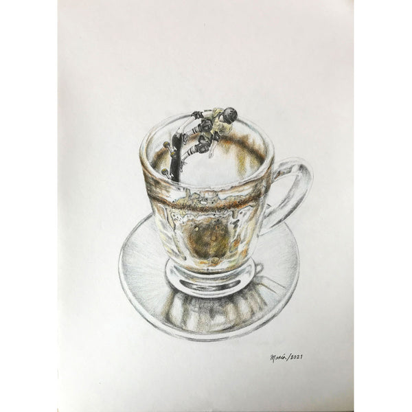 Esta serie surgió en el contexto de la pandemia, inspirada por la libertad de nuestra mente, que no tiene límites, aún en medio del aislamiento y el encierro. Para mí el café siempre ha sido algo que me reconforta. Es también un evento social, un momento afectuoso para vernos y conversar, y esas conexiones humanas fue algo de lo que el aislamiento social también nos privó. Sin embargo, a una situación tan compleja y oscura quise darle una nota positiva y transformarla en un mundo de posibilidades, aún en soledad y dentro de un espacio delimitado. La taza de café, además de ser un elemento que en mi día a día me da tranquilidad y que me hace vivir más despierta –un lugar intangible de seguridad y de bienestar– en mis dibujos se convirtió en una metáfora del lugar que habitamos, una metáfora de nuestra casa.