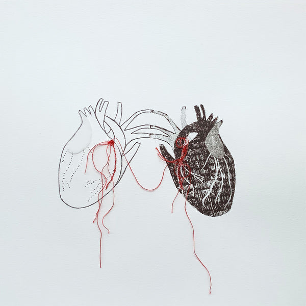 Técnica: Serigrafía intervenida manualmente con costura de hilo y papel recortado sobre papel Fabriano de 220 gr. Prueba de artista firmada que hace parte de serie de tres impresiones